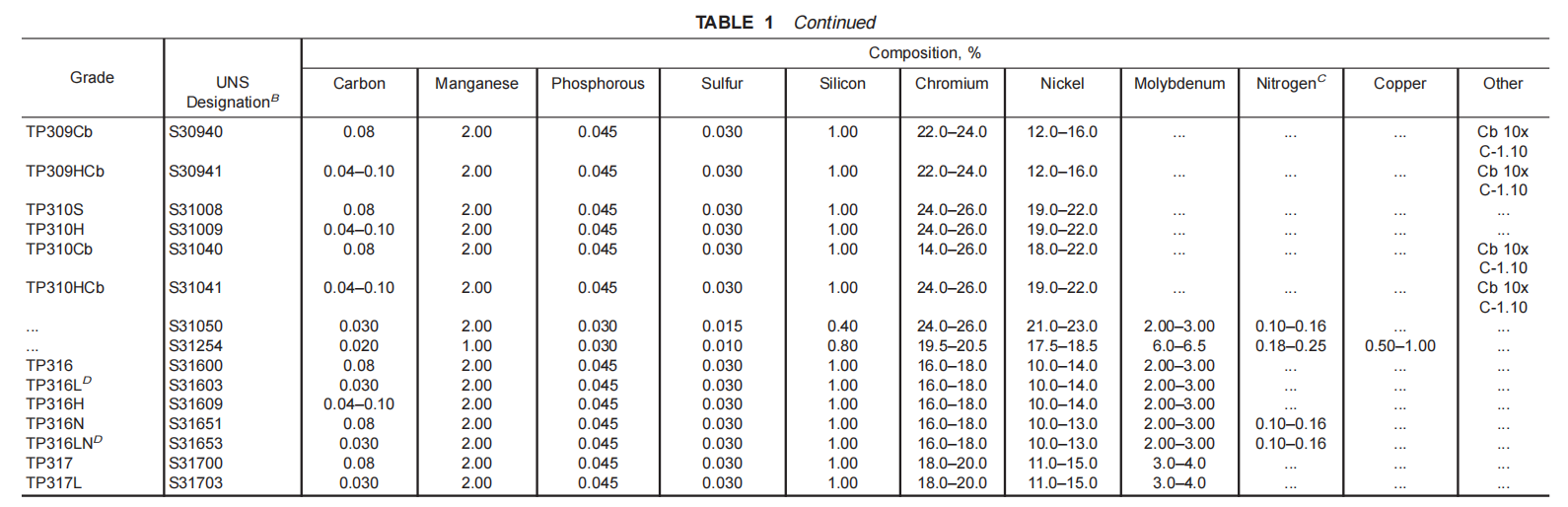 ASTM A249 Standard Specification covers nominal-wall-thickness welded tubes and heavily cold worked welded tubes made from the austenitic steels listed in Table 1, with various grades intended for such use as boiler, superheater, heat exchanger, or condenser tubes.