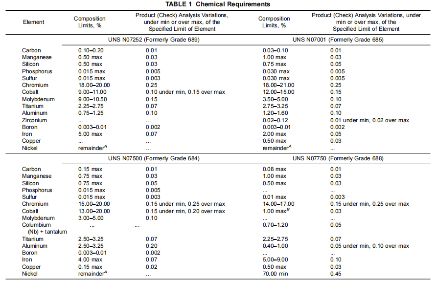 ASTM B637 Standard Specification covers hot- and cold-worked precipitation-hardenable nickel alloy rod, bar, forgings, and forging stock for high-temperature service (Table 1).